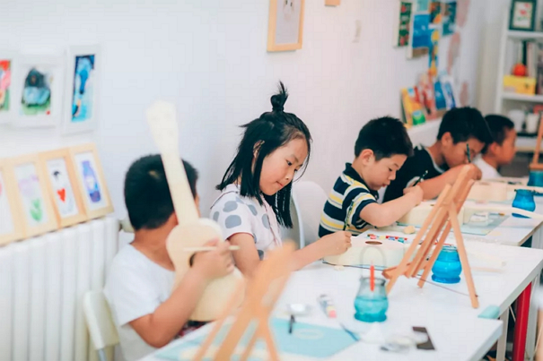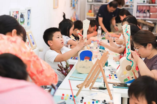 在老師的專業(yè)指導(dǎo)下,小朋友們發(fā)揮自己的想象力和創(chuàng)造力,從構(gòu)思圖樣、繪制稿圖到調(diào)色、上色再到組裝琴頭、琴枕、指板。