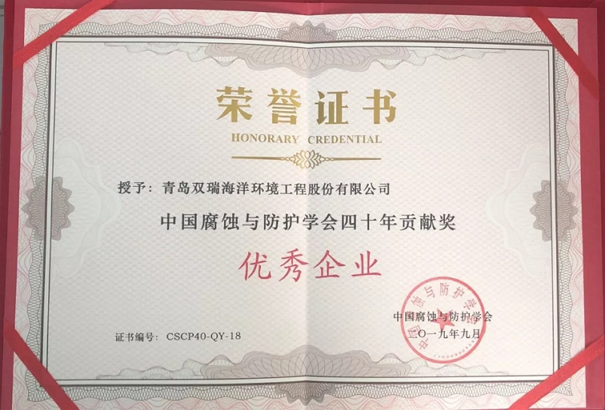 青島雙瑞榮獲“中國腐蝕與防護學(xué)會四十年貢獻獎―優(yōu)秀企業(yè)”榮譽