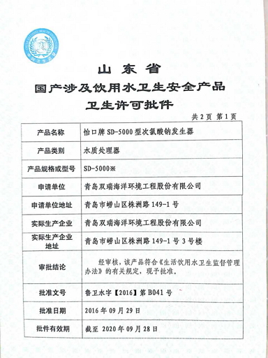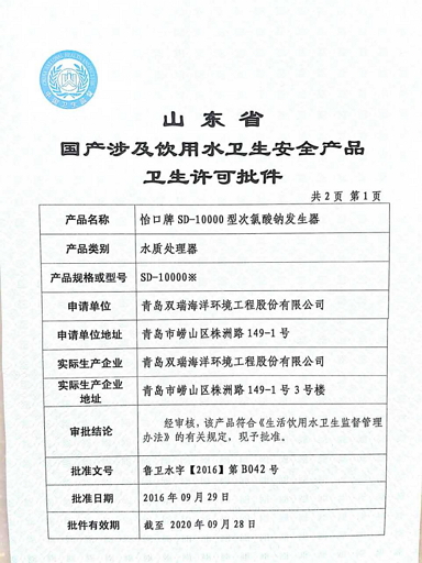 青島雙瑞公司飲用水消毒裝置獲山東省衛(wèi)生許可批件