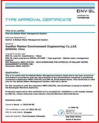 2018年4月6日,青島雙瑞海洋環境工程股份有限公司(以下簡稱青島雙瑞)BalClor?船舶壓載水管理系統(BWMS)全球首獲挪威船級社(DNVGL)代表挪威海事管理主管機關(NMA)頒發的基于IMO 新G8&G9導則的型式認可證書。這是青島雙瑞公司繼全球第四、亞洲首家獲得美國海岸警衛隊(USCG)型式認可證書之后取得的又一個具有里程碑意義的重要成就。青島雙瑞獲得IMO新G8&G9認證的BalClor?壓載水管理系統采用國際領先的高效過濾+支路電解滅活技術,處理能力范圍為170-8500m3/h。