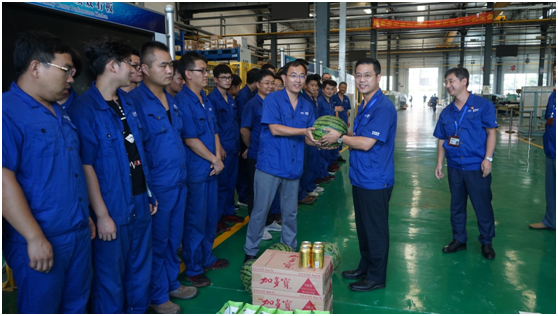 入伏以來,島城氣溫節(jié)節(jié)攀升,公司各個車間、食堂后廚等特殊工位更是熱浪滾滾、酷暑難耐。近日,為確保員工身體健康、安全工作,在公司工會和綜合部的組織下,公司領(lǐng)導一行來到組裝、熔煉、加工等車間、物資部庫房、食堂后廚等,為一線員工送上消暑西瓜、柑橘、茶葉等慰問品,勉勵大家戰(zhàn)勝高溫考驗,讓廣大員工深刻感受到公司的關(guān)愛。